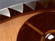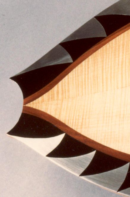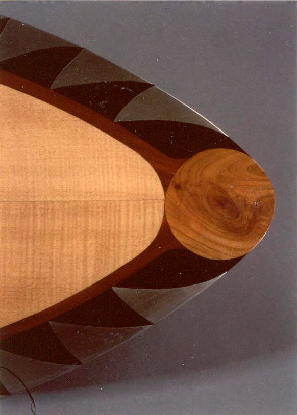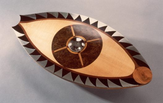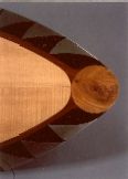 Wall Decoration, maple, cherry, walnut-burr and prune wood, curved mirror. 71 x 32 cm